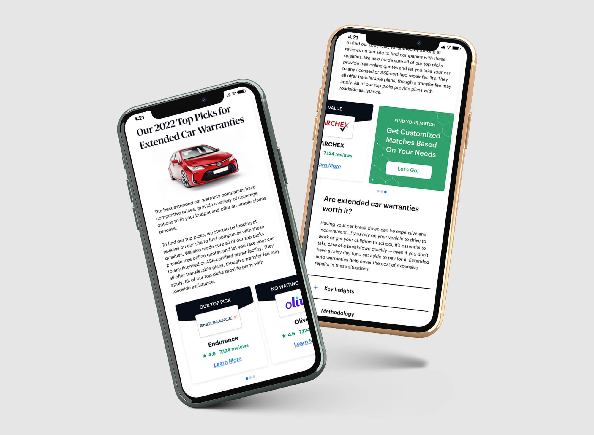 After the first two phases of changes, the template was started to perform better than before. However, I felt like we could do more from a mobile perspective. Since these Buyer's Guide templates housed a lot of content, mobile tended to be quite a long scroll and the data was proving that those templates needed to improve on scroll depth for mobile devices. To test this out, I designed out an option for the mobile experince that introduced a carousel styled section of the top brands. After an intial test of this new design, the scroll depth of users on people increased and they engaged more with the top brands in the new carousel section.