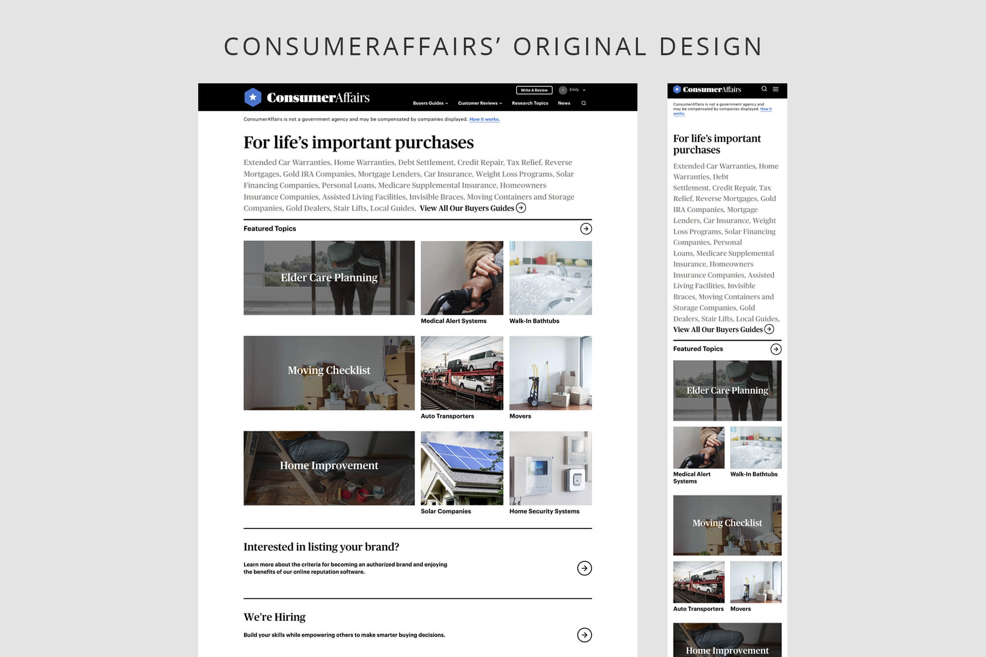 ConsumerAffairs has been around for over 20 years and has continued to add new categories, brands reviews, and educational guides to their site. However, their site was hard to navigate, so their users missed out on all the resources they offered. The site was also in need a fresh new look, so I infused their branding throughout the templates to bring more life and trustworthiness into their site. Between the site architecture changes and design refresh, we saw a significate drop in bounce rate and a higher clickthrough rate on the site.