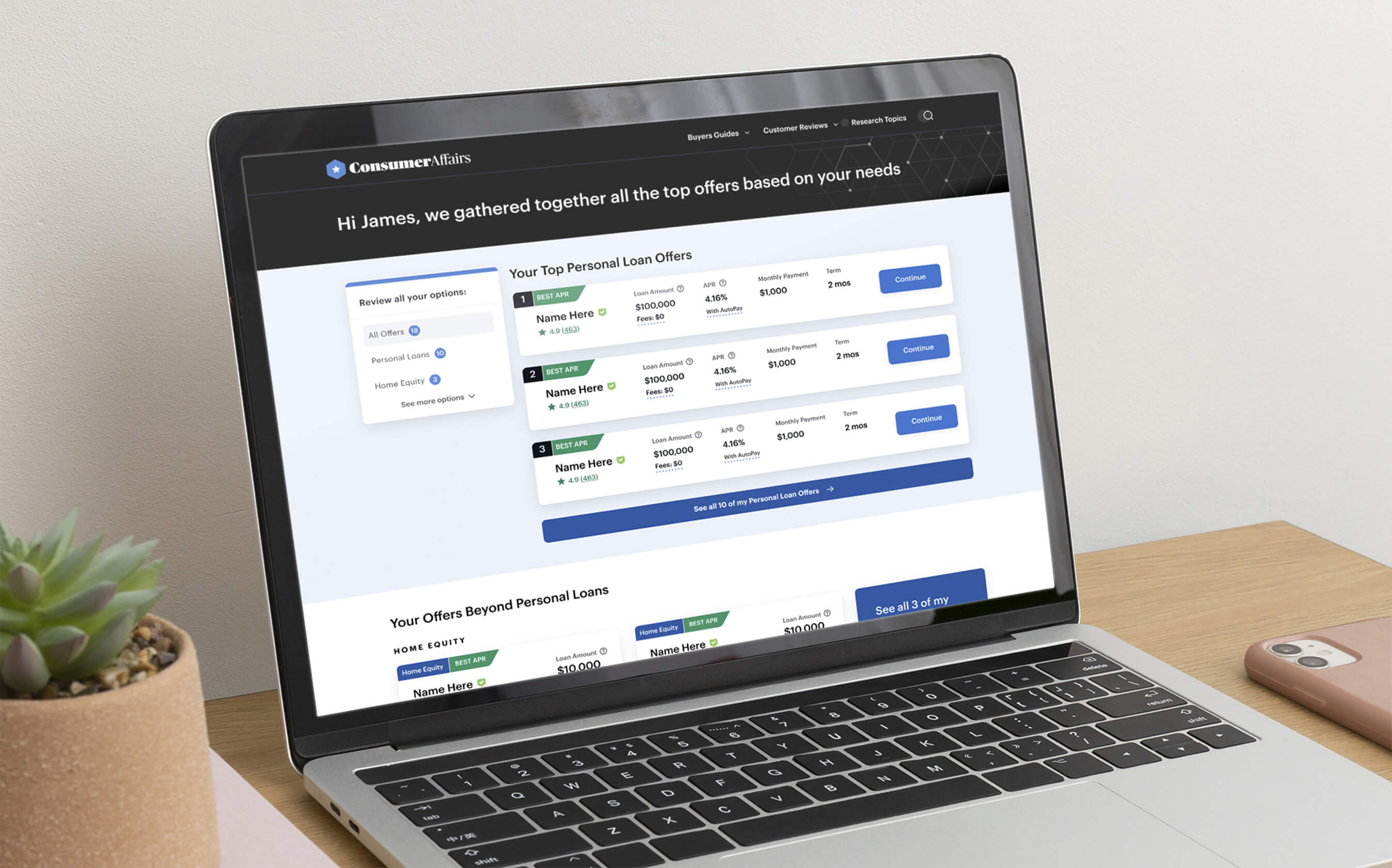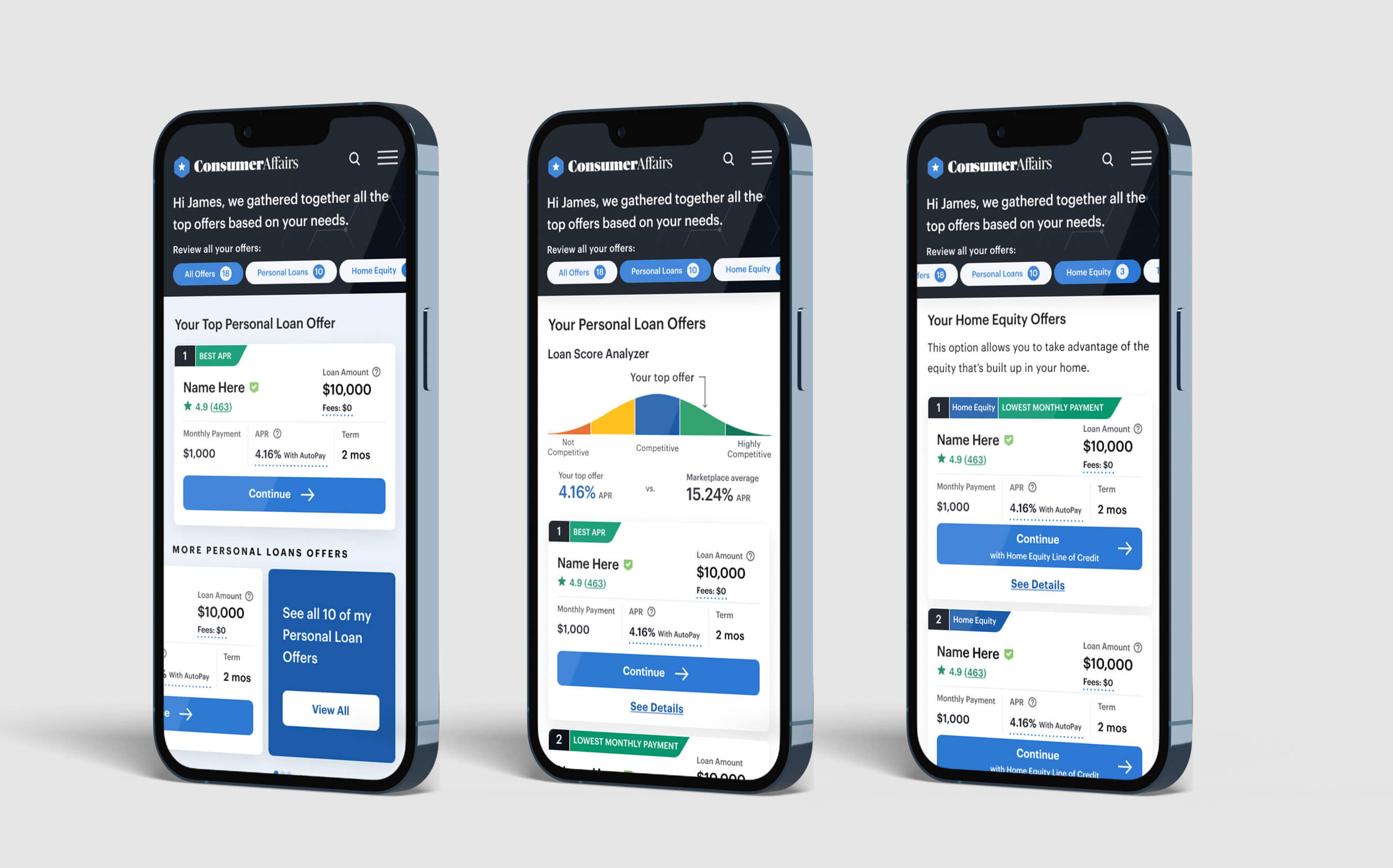After the matching tool was built out, I thought it would be good to move onto the next phase of what the offers we were providing users through that tool could look like. At the time of building out the matching tool, the results pages were simpler and really only provided options for one specific topic when a secondary option could actually be a better fit for a user. For example, if a user was interested in getting a personal loan, based on the information they provided us, we could also present home equity options to them since it could be a good alternate option that they might not of considered. This offer dashboard adds extra options in the intial landing screen ("All Offers" tab) while still highlighting the main option the user was intestested in at the top.